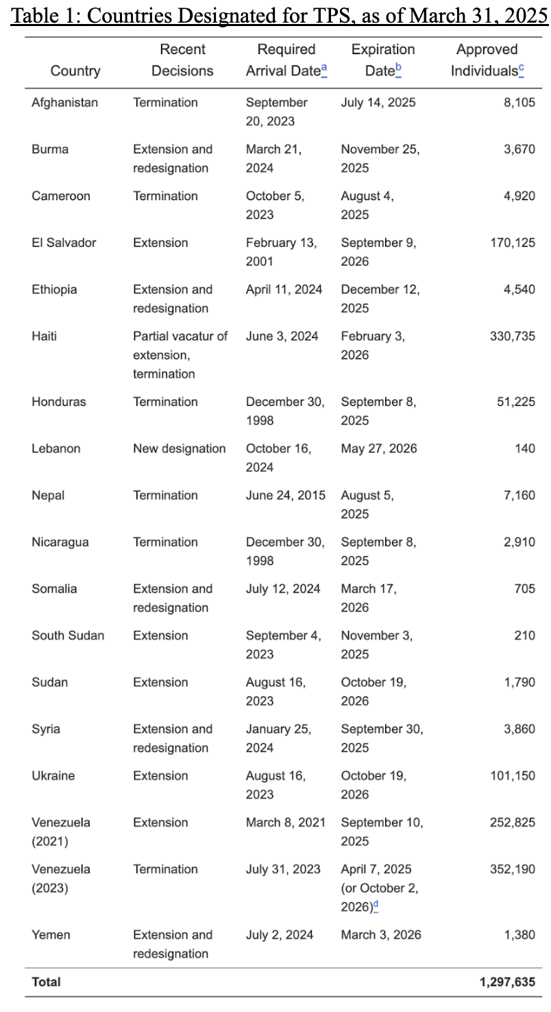 As shown in Table 1 as of March 31, 2025, approximately 1.3 million individuals have been approved for TPS. The termination of TPS programs—particularly for countries such as Haiti and Venezuela, which account for hundreds of thousands of beneficiaries—would have profound consequences on their lives. According to a September 12, 2025 ABC News article, the recent court ruling to maintain TPS protections for Haiti and Venezuela at least through next year has not yet been reflected accurately on official websites. The report notes that TPS holders face risks, including job loss. One court declaration described a San Antonio man detained in May who was informed he would not be released until the website was updated. Another declaration came from a TPS holder employed at an Amazon warehouse for three years, who was told by human resources that a copy of the September 5 court order and an attorney’s letter were insufficient to authorize continued employment.